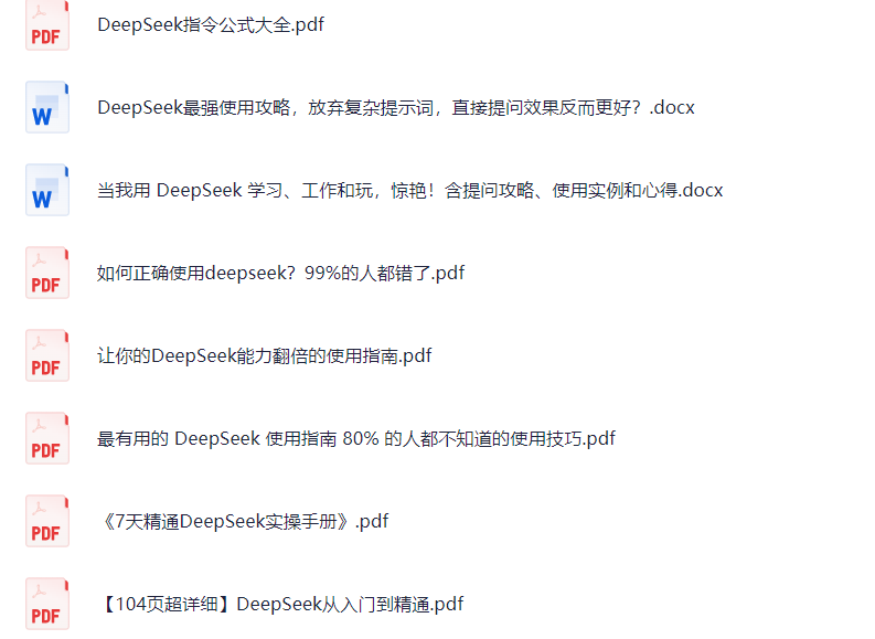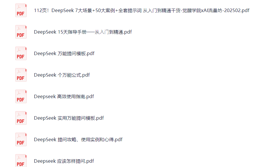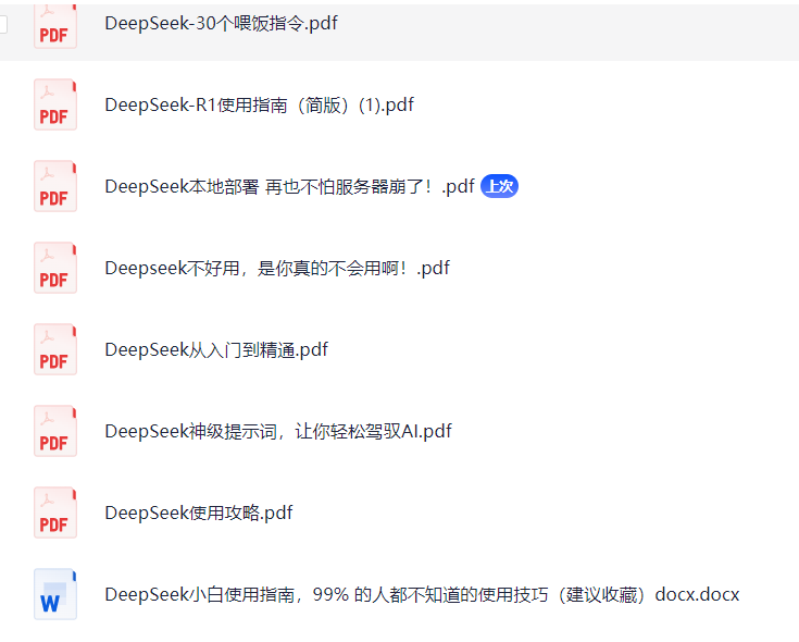 这些关于DeepSeek的文件都是我在外面花高价各种搜集来的,对于现在需要使用DeepSeek的同学来说,简直就是宝藏,里面的文档够你学了,学完了你会回来谢我的。错过了你一定会后悔的!大家不要再到处去交钱,当韭菜了,你去外面搞这些资源,可能得花好几万,资源比较珍贵,咱们这里免费转存,以防失效,点击下方链接,尽快转存吧!